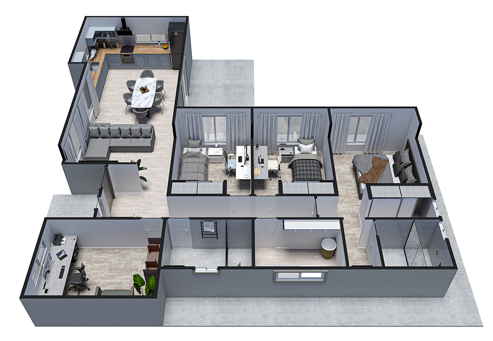 PANELES EXTERIORES: Revestidos con placas cementicias Superboard aptas para cualquier tipo de revestimiento o terminación. Con colocación de placas OSB en paredes perimetrales.